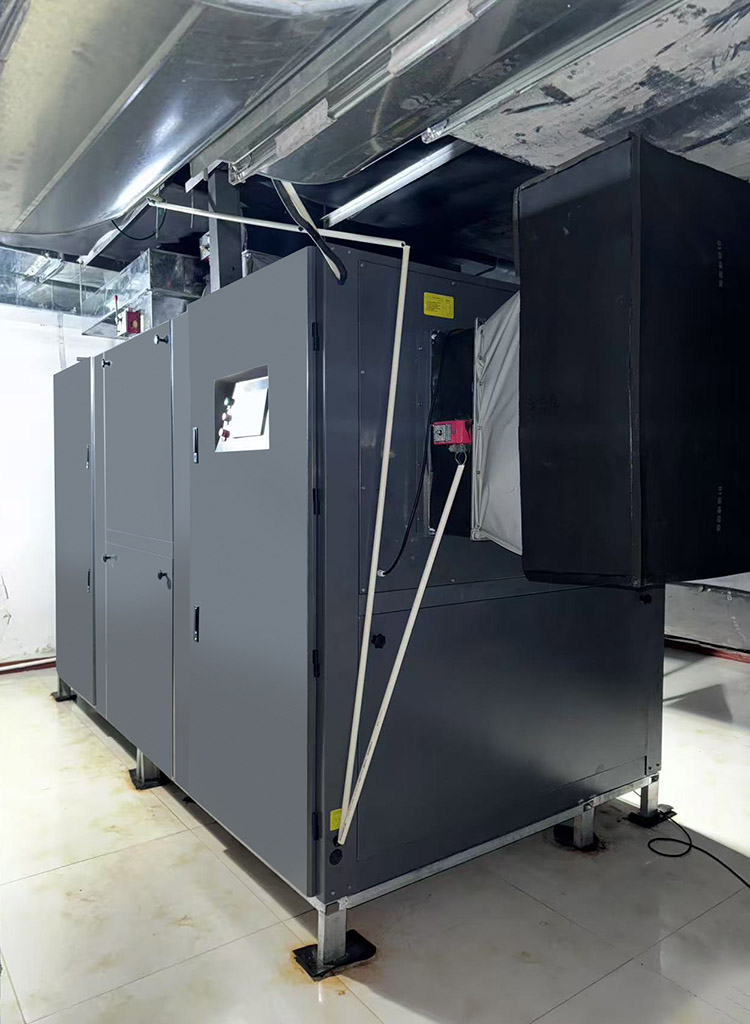 The design utilizes Aolan's heat pump counter-flow liquid desiccant units. The equipment is installed in the indoor air-conditioning machinery room and connects to the museum's collection storage area via supply and return air ducts. It features micro-air supply indoors, ensuring uniform airflow distribution and maintaining extremely low fluctuations in indoor temperature and humidity. For most of the time, it operates in full return air mode to conserve energy. When personnel enter or exit the collection storage area, the fresh air damper can be opened to provide the necessary fresh air, allowing the unit to operate in mixed-air mode. Throughout the year, it operates automatically as needed, including cooling, dehumidification, heating, and humidification modes. Based on changes in indoor and outdoor temperature and humidity, it automatically switches between these modes to maintain a largely constant indoor temperature and humidity.